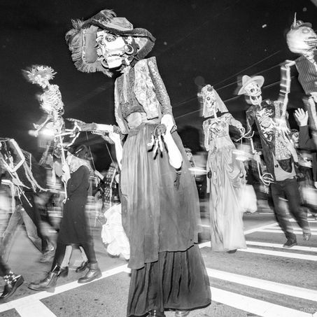 This is a communal Soul Train style line dance in the street with Krewe’s giant skeleton puppets and you! Imagine a party with our dearly departed in the street.